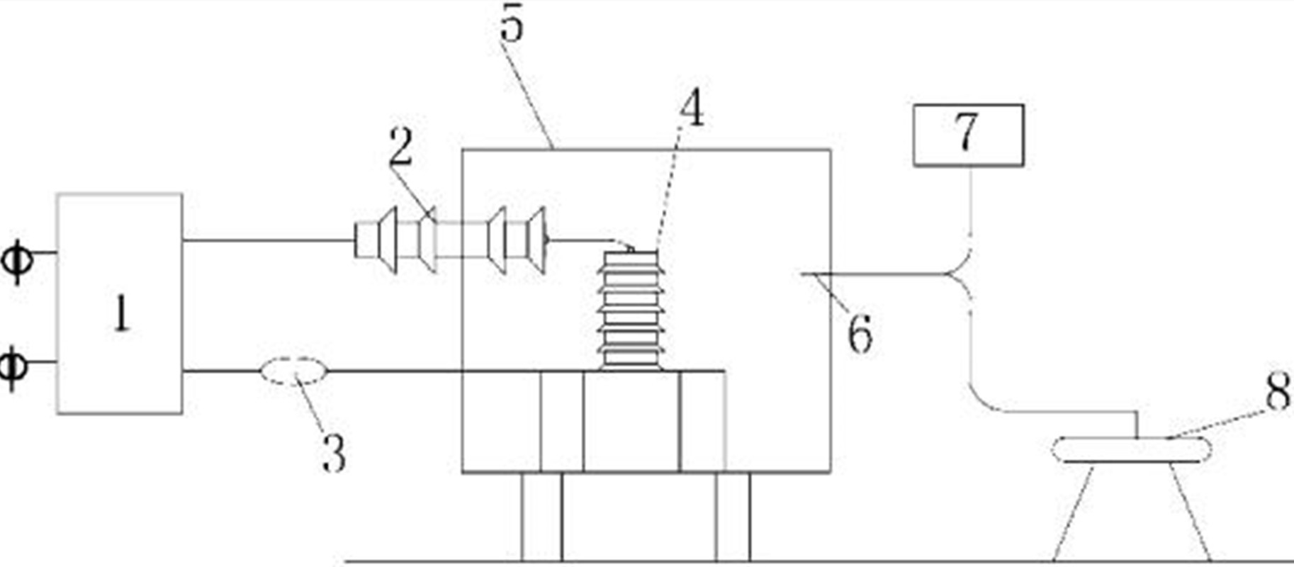 待測復(fù)合外套直絕緣子安裝于霧室內(nèi);穿墻套管穿過霧室的側(cè)壁,一端位于霧室內(nèi),另一端位于霧室外部;待測復(fù)合外套直流避雷器頂端通過穿墻套管連接直流試驗(yàn)電源,底端通過電流取樣單元連接直流試驗(yàn)電源;鹽水箱和空壓機(jī)通過各自的管路連接位于霧室內(nèi)的噴霧孔。
