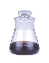 KIMAX conical-shaped bottle offering greater stability. Used in the determination of specific gravity for a large variety of semi-solid materials and emulsions, such as road oils, road tars, soft tar pitches, and asphalt cements (ASTM D70); drying oils, varnishes, resins, and related materials (ASTM D1963); water and brine (ASTM D1429); and insulating varnishes (ASTM D115). Short length stopper is conical on the underside and has a hole approximately 1.6 mm in diameter to allow air to escape. |